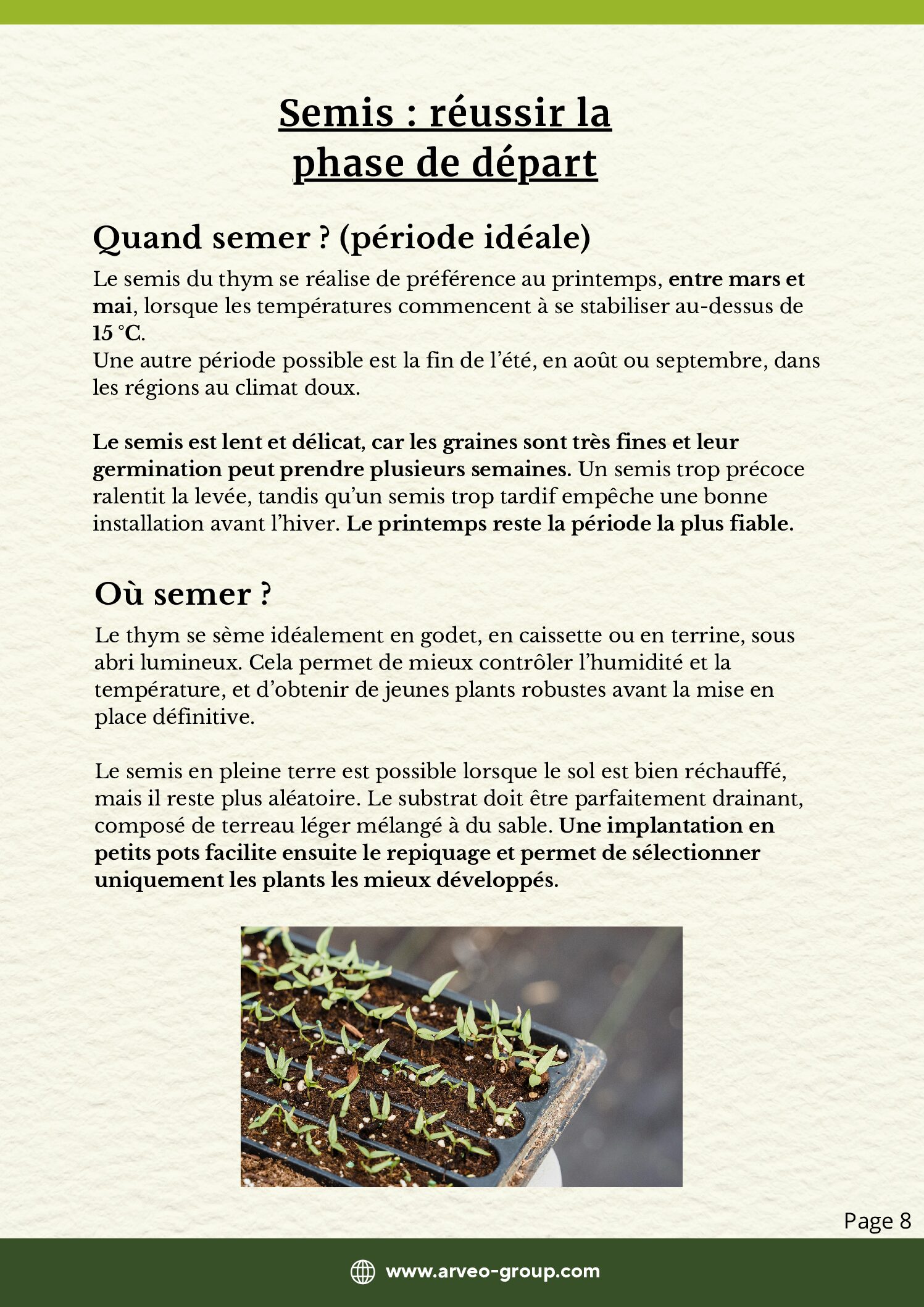Ce guide Arveo t’accompagne pas à pas pour réussir la culture du thym, de la plantation à la récolte. Clair et structuré, il t’aide à comprendre les besoins spécifiques de cette aromatique méditerranéenne résistante, à éviter les erreurs courantes (excès d’eau, sol trop riche, perte d’arôme) et à obtenir des plants sains et productifs sur la durée.
